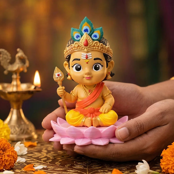 With vibrant colors, detailed crown work, peacock feather design, and the sacred Vel (spear), this idol radiates devotion and positivity. Its compact size makes it perfect for car dashboards, home temples, office desks, study tables, or gifting.